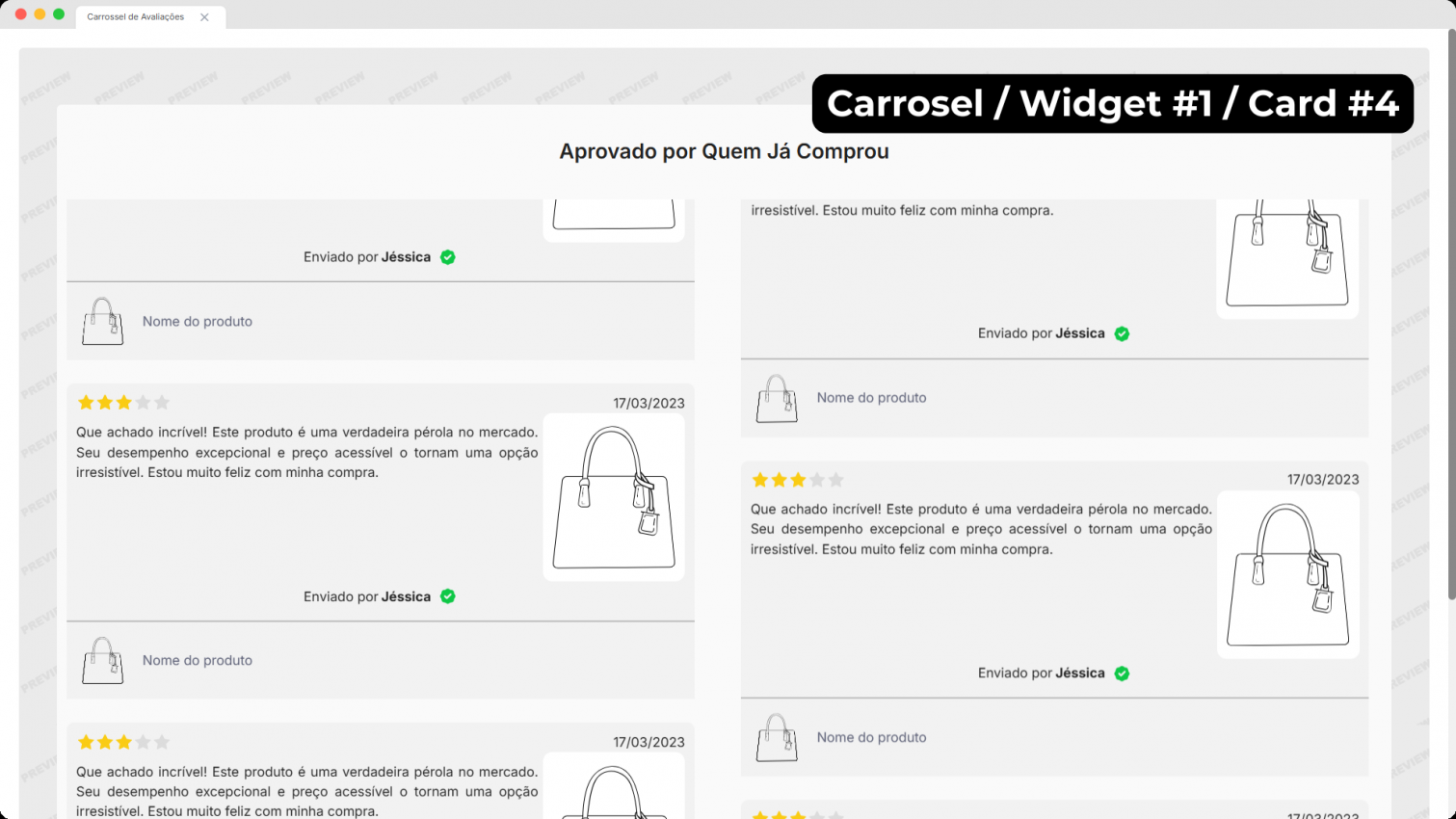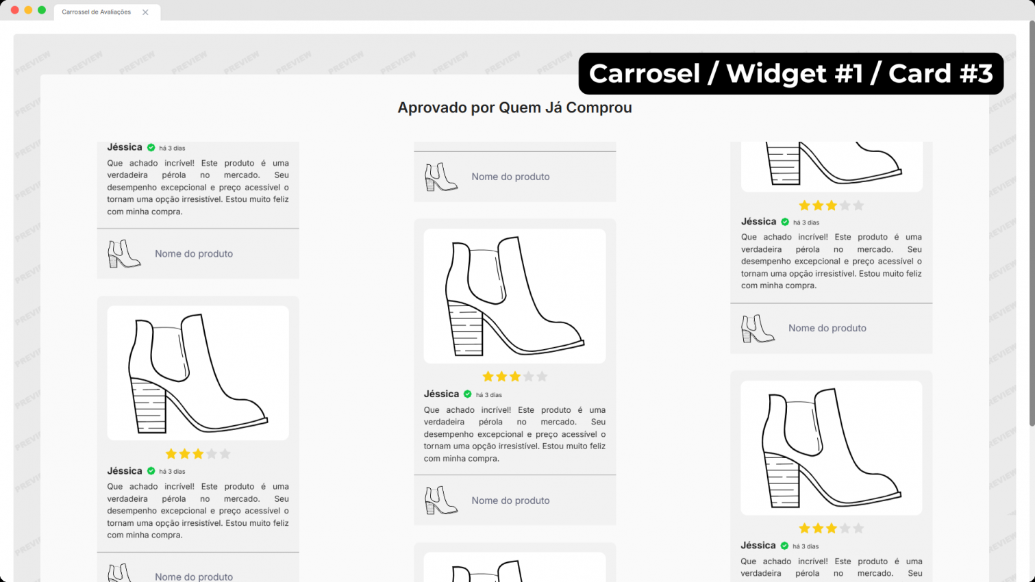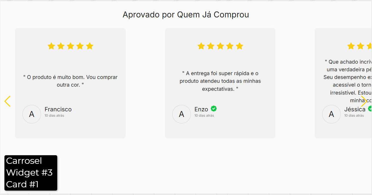 Este widget exibe automaticamente as avaliações marcadas como favoritas no painel de avaliações, permitindo destacar os melhores feedbacks dos seus clientes na loja.