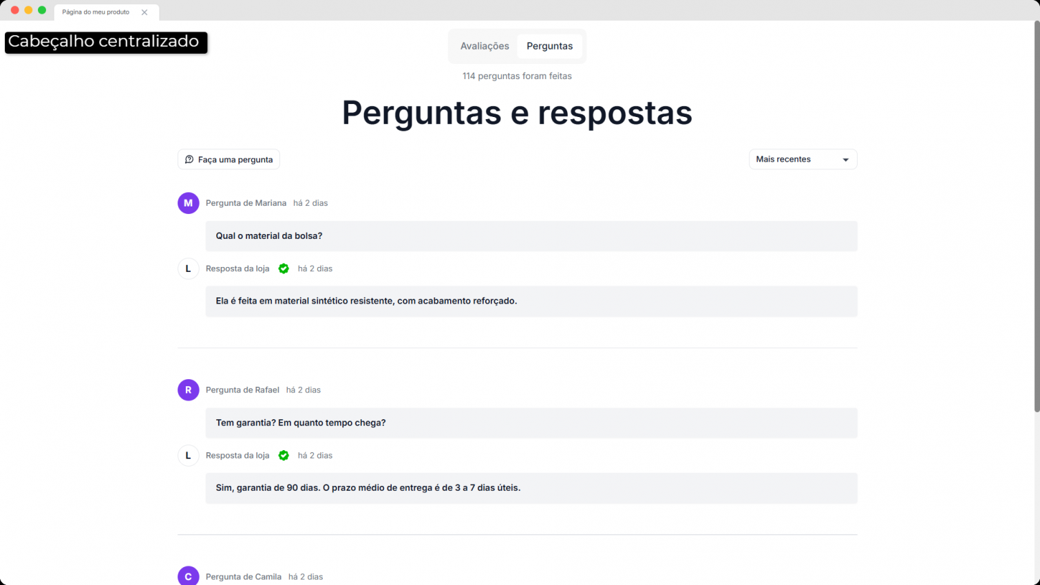 Explore o carrossel para visualizar as opções de exibição do template de perguntas no Lily Reviews. O módulo utiliza o template Lista e permite escolher entre o alinhamento do resumo centralizado ou em coluna à esquerda, para se adaptar perfeitamente ao layout da sua loja.